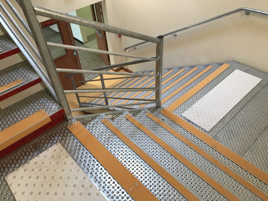 - Rails de guidage, bandes d’éveil à la vigilance, nez de marches contrastés, pour renforcer la sécurité et l’autonomie des personnes à mobilité réduite.